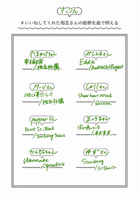 #/いいねしてくれた相互さんの絵柄を曲で例える お待たせしました‼️‼️‼️洋楽って言ったけど自分の好みに偏りがありすぎてむりだったので邦楽も入れてます twitter.com/jo_sa05/status…
