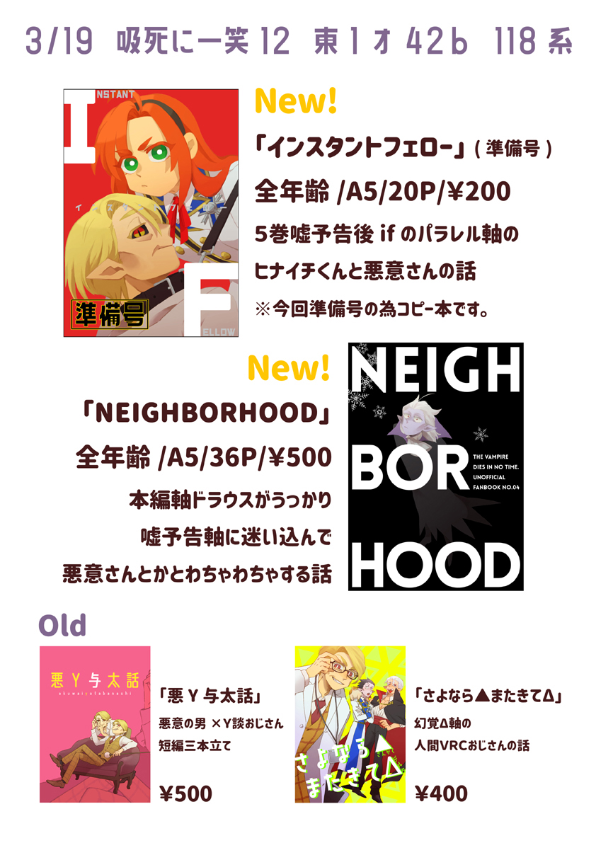 3/19の一笑12おしながきです~~~~2枚目画像のポスター吊るしてますので目印にどうぞ~~~~✌✌✌ 本編ウスin噓予告軸のサンプルはこちら☞【pixiv.net/artworks/10595…】 よろしくお願いします☺☺☺