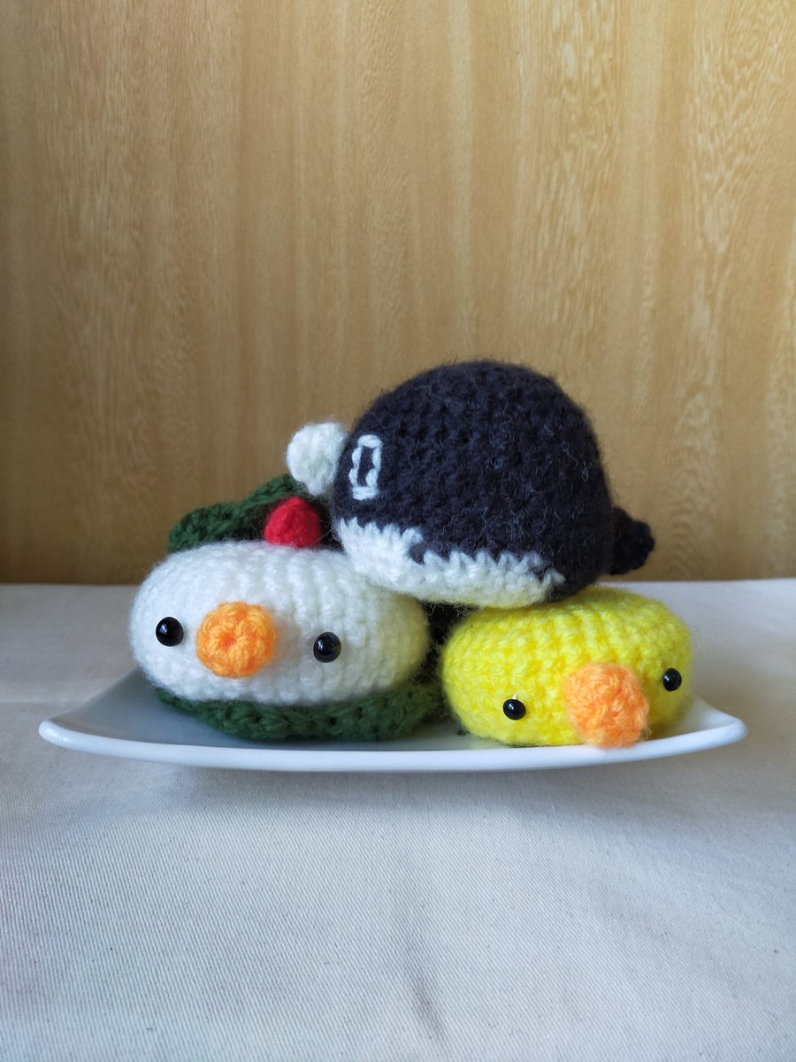 #テイペン魚拓 #あみぐるみ とりもち。 かしわもち、べこもち、ひよこ?