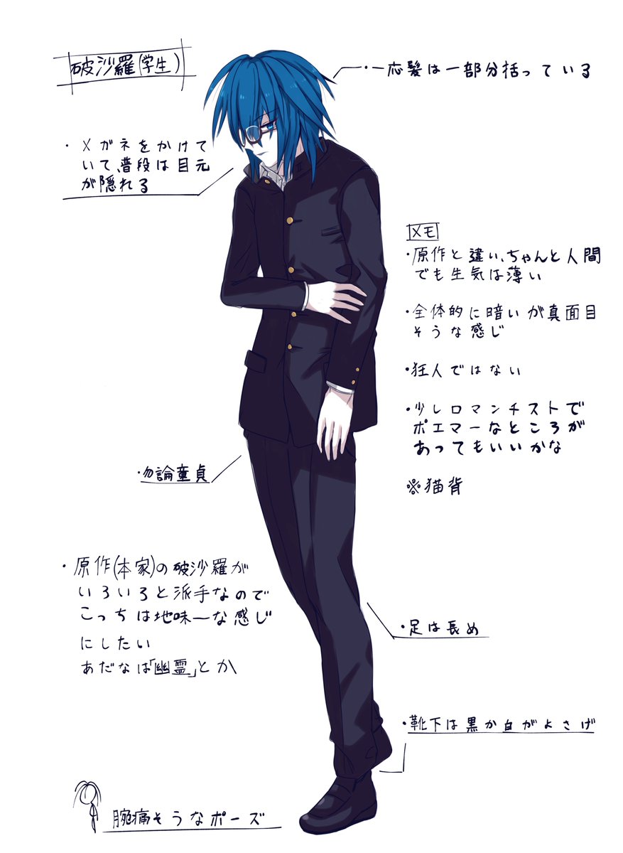 現代破沙羅(制服)の設定画を描いてみました。これで少しは方向性は決まったかな…何か感想などあれば気軽にどうぞ✍️😀 (2枚目は自分用メモ) #サムライスピリッツ