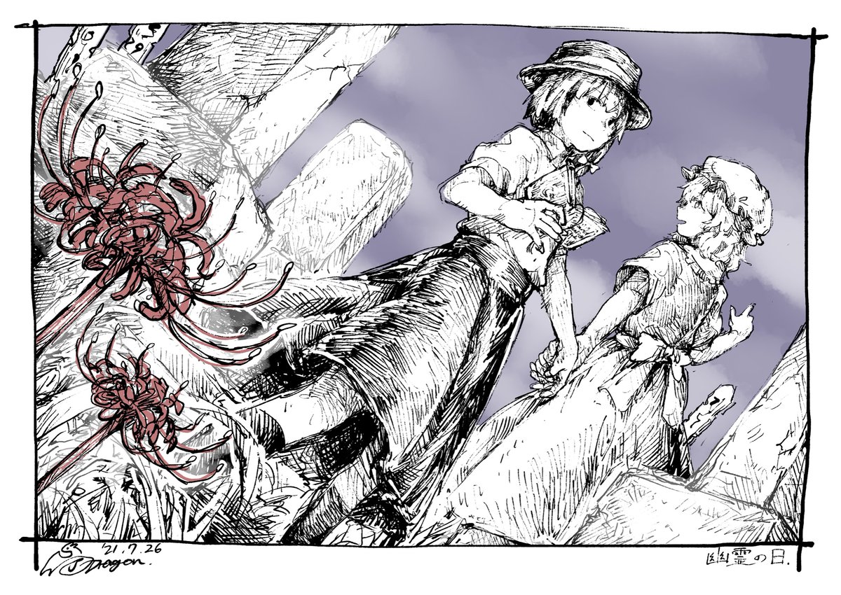 その墓地には幽霊がいるらしい。 「——って、最近そんな噂があるらしいよ。メリー」 「なるほど。確かに雰囲気満点ね」 「という訳でここからは私たちの時間。秘封倶楽部、活動開始よ!」 #7月26日 #秘封366