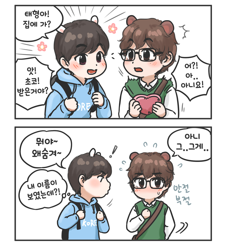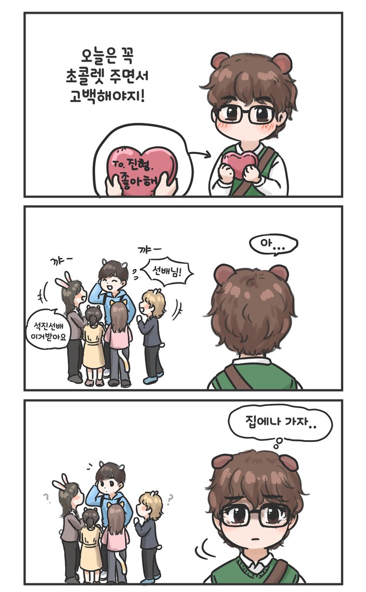 발렌타인데이 만화~~ 대학생 뷔진으로 인기많은🐹선배를 짝사랑하던🐻이 고백하려고 하다가 그만..!! #뷔진 #taejin