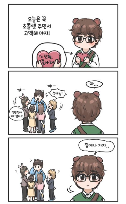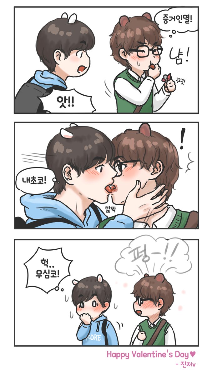 293 1438 발렌타인데이 만화~~ 대학생 뷔진으로 인기많은🐹선배를 짝사랑하던🐻이 고백하려고 하다가 그만..!! #뷔진 #taejin 22/02/14 23:24