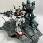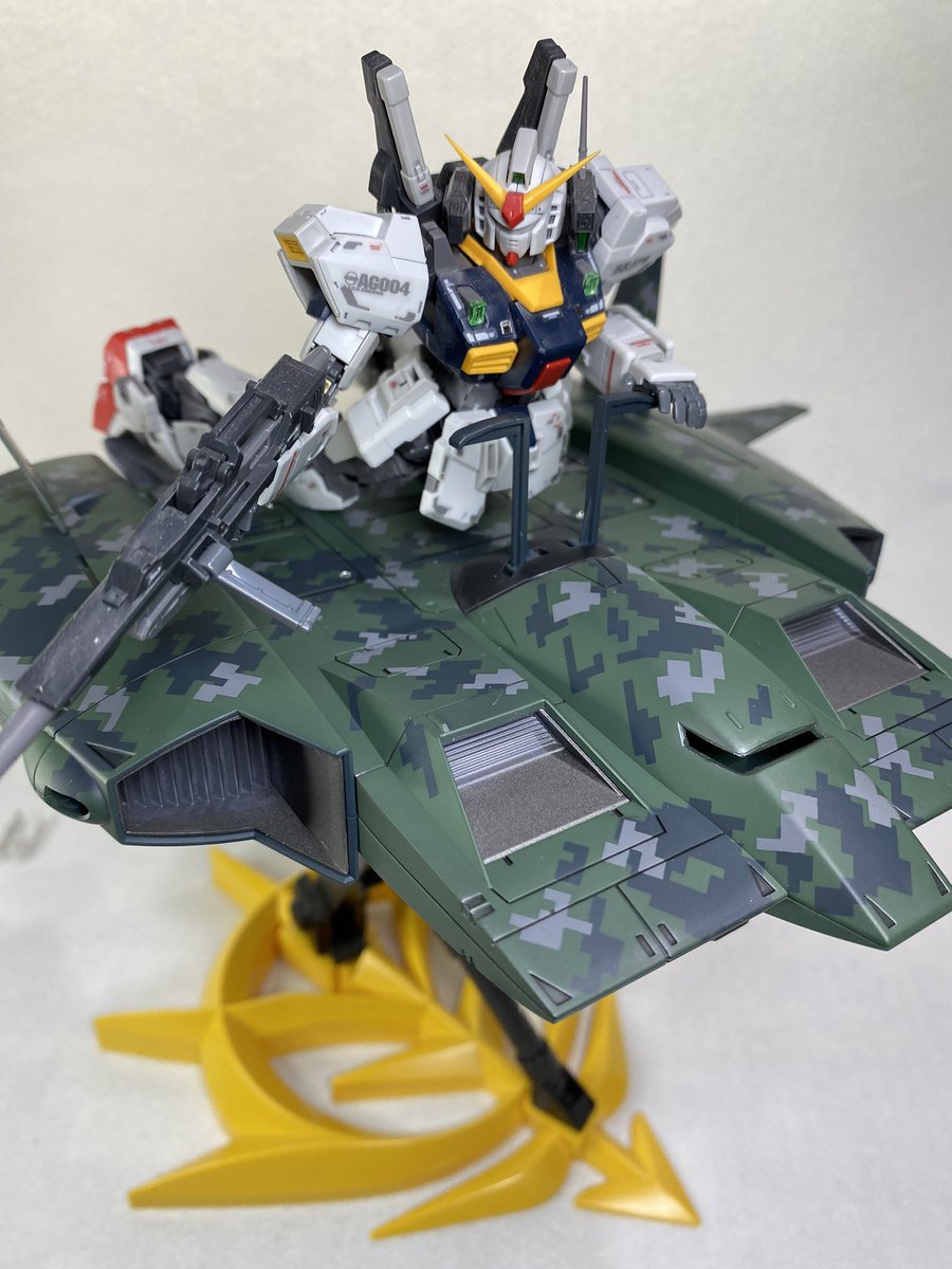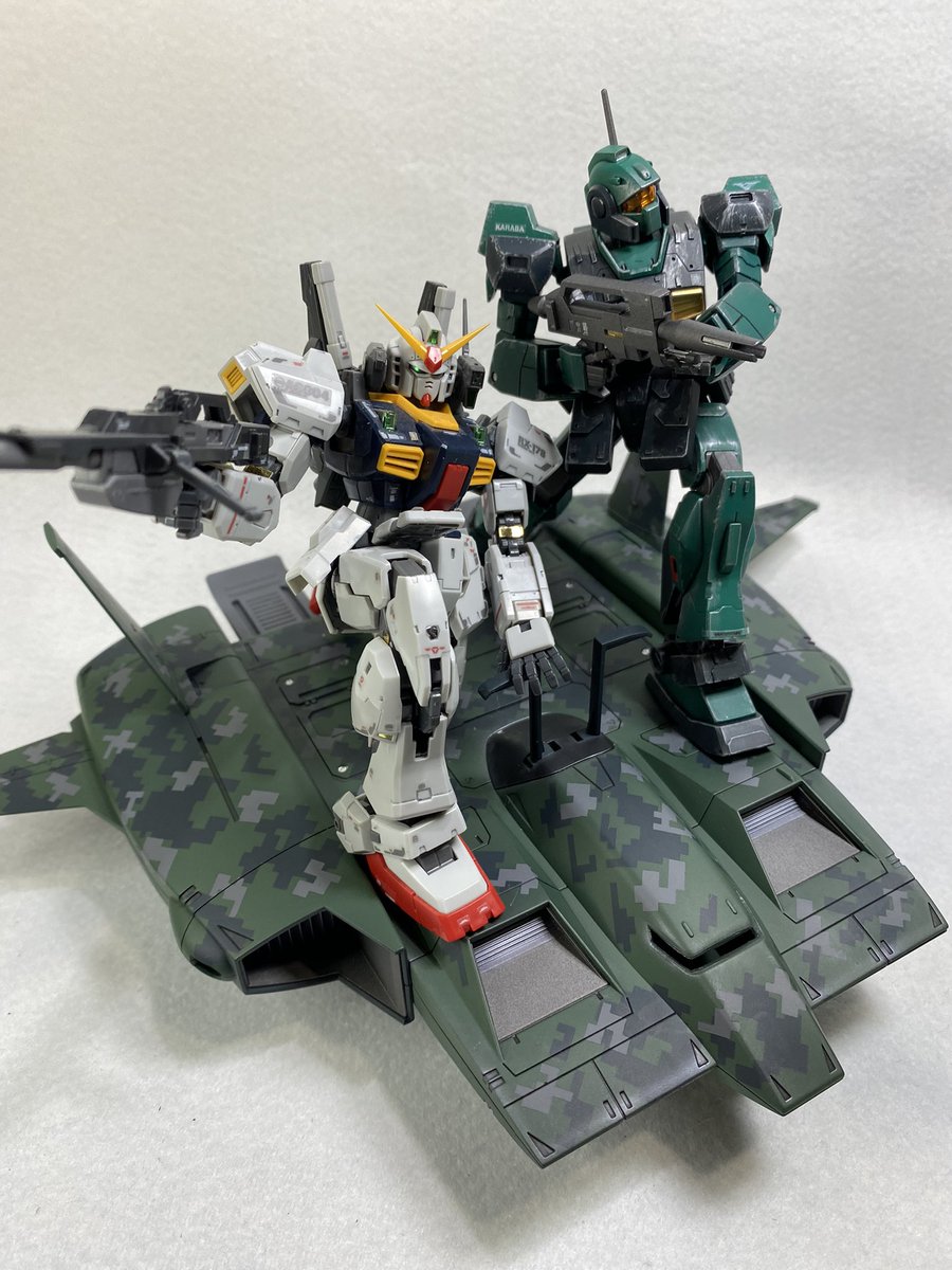 ドダイ改完成です。 水転写デカールが苦手なのでピクセル迷彩柄でごまかしました。 やっとネモとMk2を乗せらた。 #ガンプラ好きと繋がりたい #ガンプラの画像を貼るとRTされると聞いて #ガンプラ