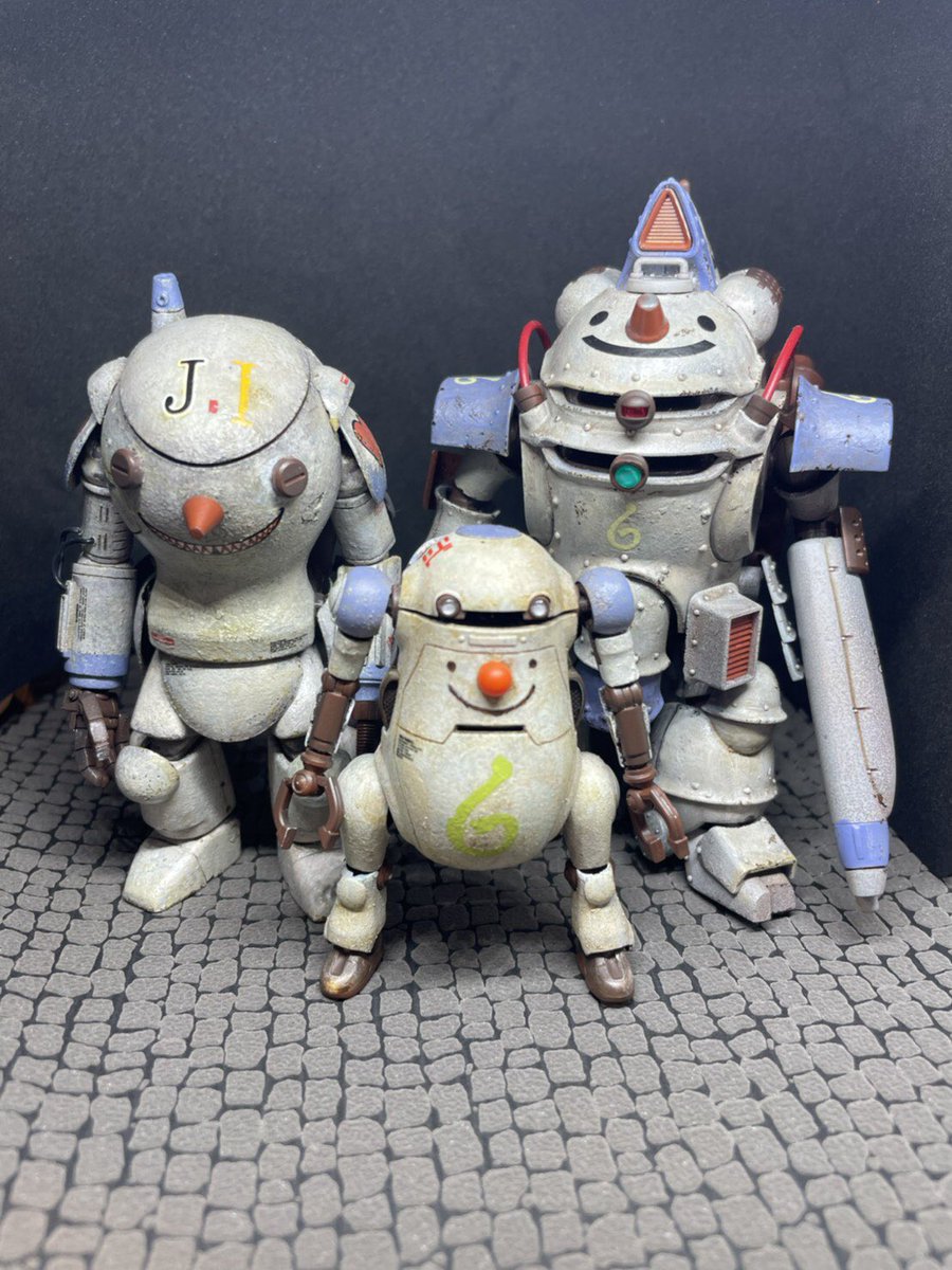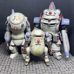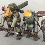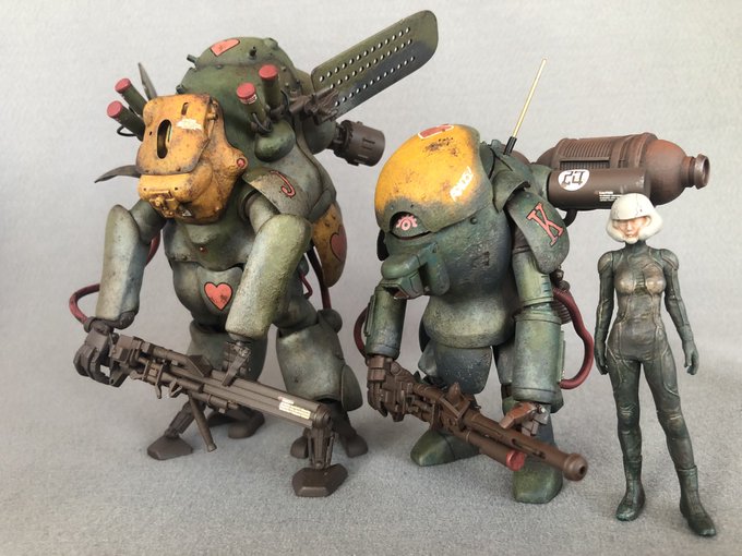 プラウラー完成。他キットの余剰パーツ追加してみました。マシーネン はシンプルな曲面とゴチャゴチャメカのバランスが絶妙。前に作ったゴーストナイトとカラーリング合わせてみたらプロトタイプ的な並びになりました。 #ゴーストナイト #マシーネンクリーガー #MaschinenKrieger #プラウラー