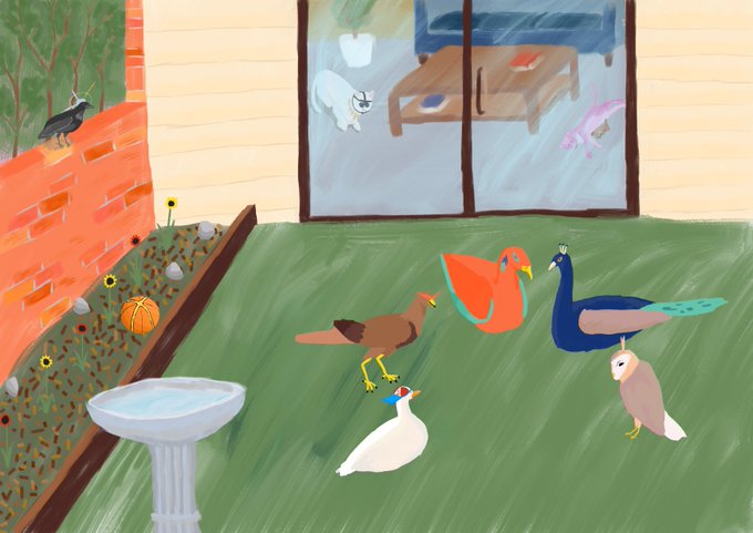 Some birds have assembled in my back yard. One of them seems to be on the fence to join them though. Bring on the Holotori collab. #holobird #artsofashes #DrawMEI #Luillust #Reinessance #プロテインザスバル #kronillust