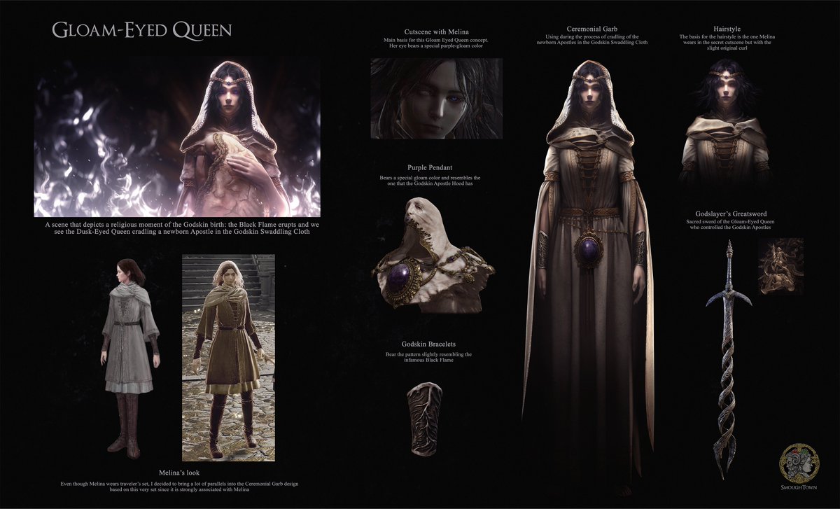 Some concept art I made for the latest @SmoughTown video on the Gloam-Eyed Queen. This particular design depicts her ceremonial garb worn when conducting the Godskin birth ritual~ Please check out Smough's awesome video here: youtu.be/lKqR4WXMa7Y #EldenRing #EldenRingFanart