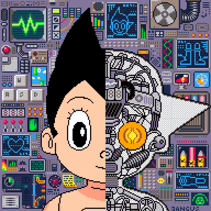 16 34 What's Inside Astroboy 2021 with a fun background of things i like :) #pixelart #dotpict #astroboy #pico8 #fanart 22/11/27 10:44