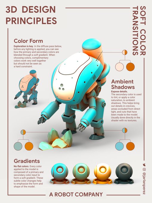 Recently, there’s been a lot of new people discovering my ARC Robots designs. Here’s a sheet with a few design principles on how I approach color. #Conceptart #ArtistOnTwitter