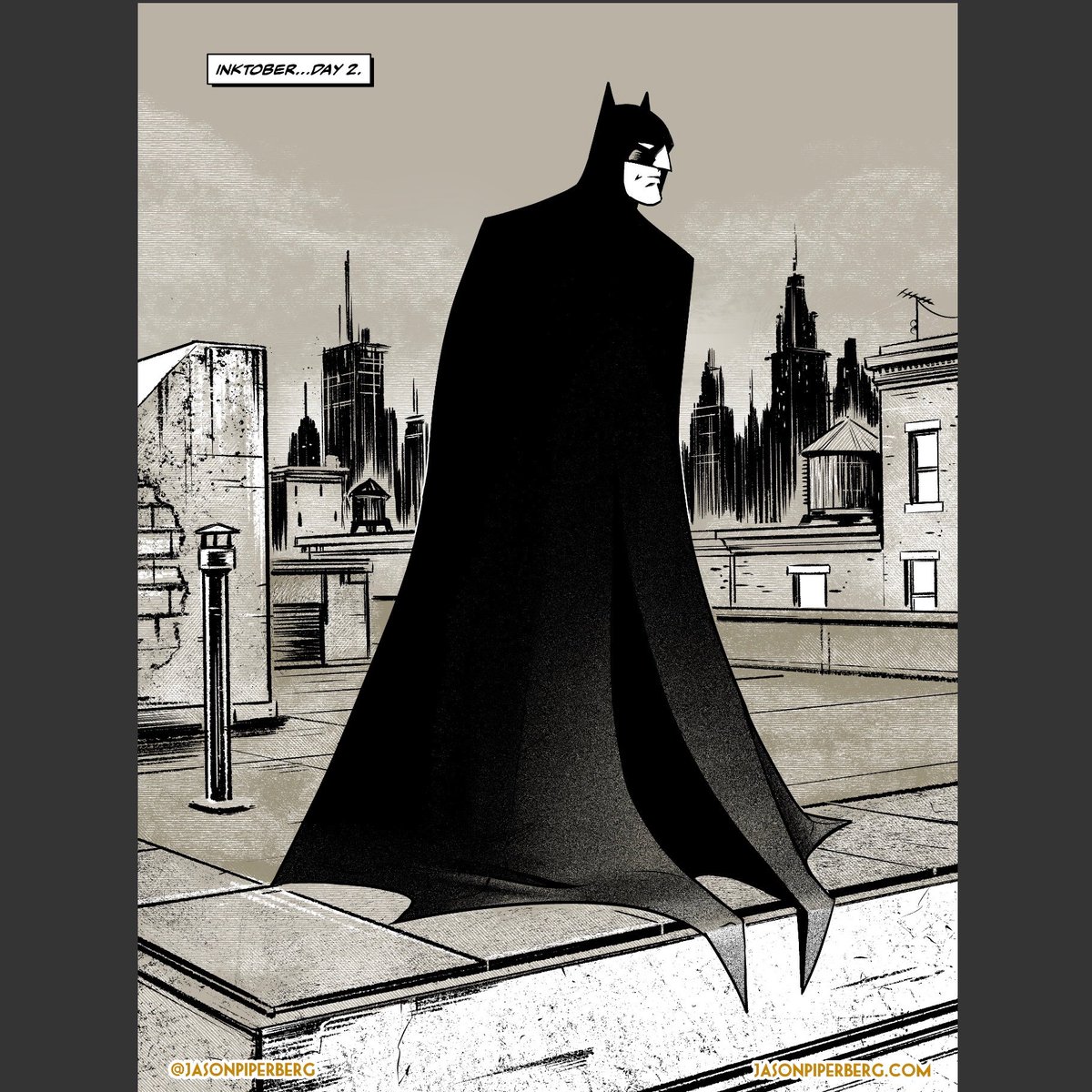 Here’s my #inktoberday2! #Batman on a roof. Tomorrow I’m definitely gonna tone it back a bit, haha! This is another digital one drawn in @clipstudiopaint on my #ipadpro. I think I’ll probably be doing all my #inktober pieces digitally this year. #Gotham #Inktober2019 #DCComics