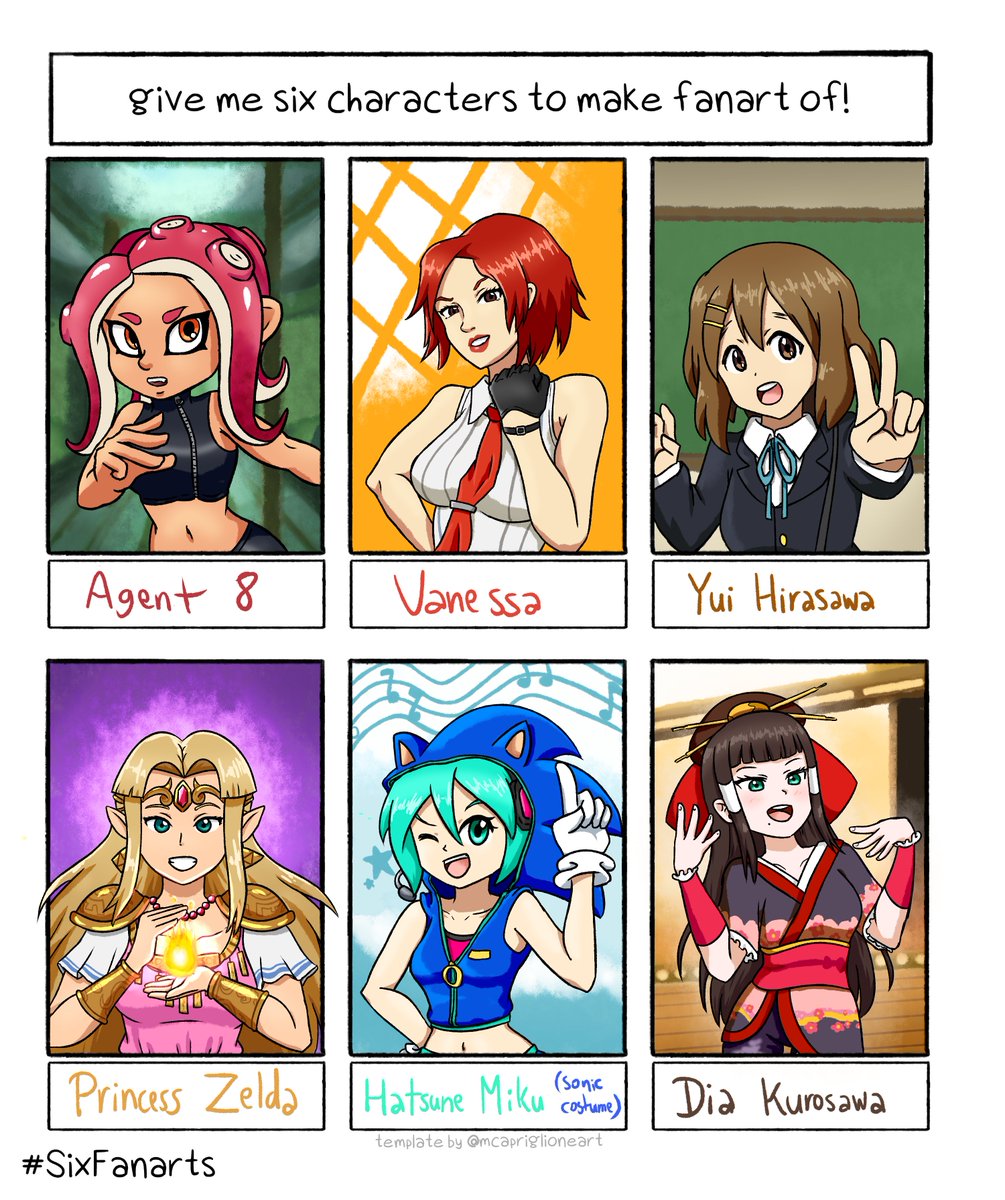 Super sorry for the long wait, but here's the finished #SixFanarts! It was really fun and also a bit challenging drawing all these characters!