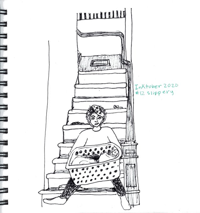 #inktober2020 #inktober @InkTober2020 Day 12 - Slippery. I laugh and wince at this sketch of reality. No running, and no socks on the wood steps she says, but does she listen?! Tailbone says...NO. Thanks Leah for making this look more graceful than it was in real life.😆
