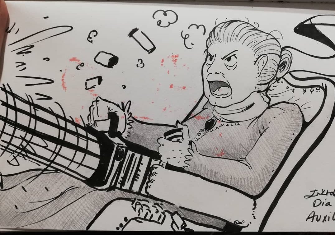 Inktober memeversil Día 3: Auxilios Siento las manchas rojas, es el copic de la anterior ilustración que ha traspasado el papel ¡Pero no iba a dejar de usarlo por eso! Además... ESO NO IMPIDE QUE ESTA VIEJA REPARTA TORTAS COMO PANES #BeyondMemeverso #Inktober