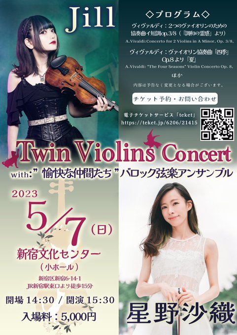 【Jill×星野沙織Twin Violinsコンサート】 with"愉快な仲間たち"バロック弦楽アンサンブル 2023/5/7(日) 新宿文化センター小ホール 開場14:30/開演15:30 🎫チケット一般発売中!! ➡︎ teket.jp/6206/21415 お席残り少なくなっております☺️ 🎟クラウドファンディング支援者限定席も好評発売中🎟