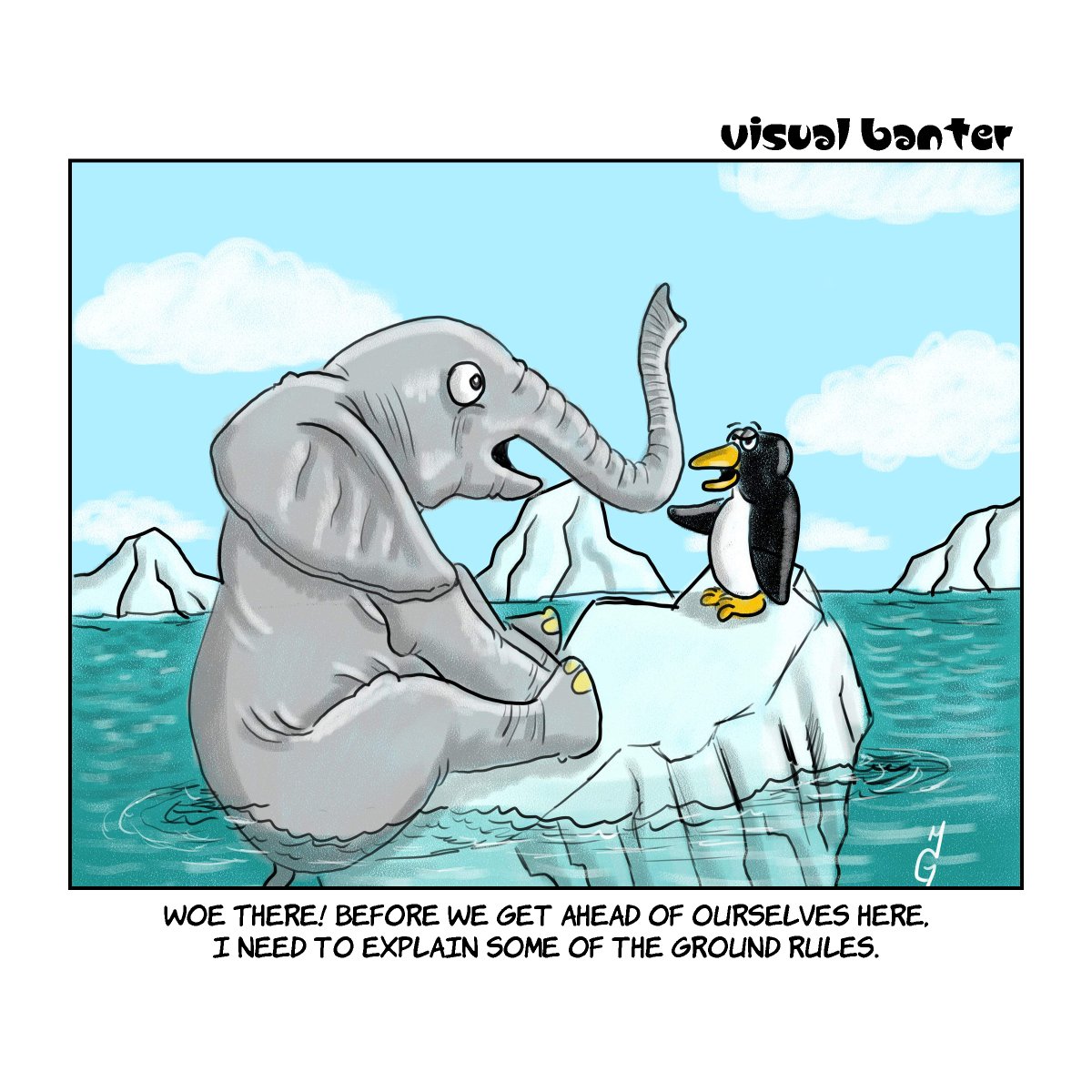 An elephant and a penguin meet on an ice flow and a conversation develops... #inktober2020 #visualbanter #illustration #day28 #pen #ink #float #comic #elephant #penguin #groundrules
