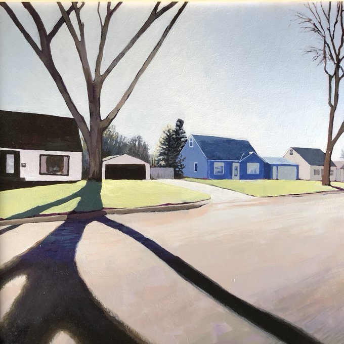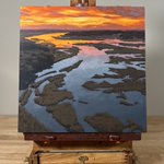 I love it when the snow fills the furrows of planted fields in the winter. A painting inspired by driving around the back roads with my dad on a cold winter afternoon. BLAZE WINTER SKY, 12x12”, Acrylic, SOLD #artwork #landscapepainting #landscapes #painting