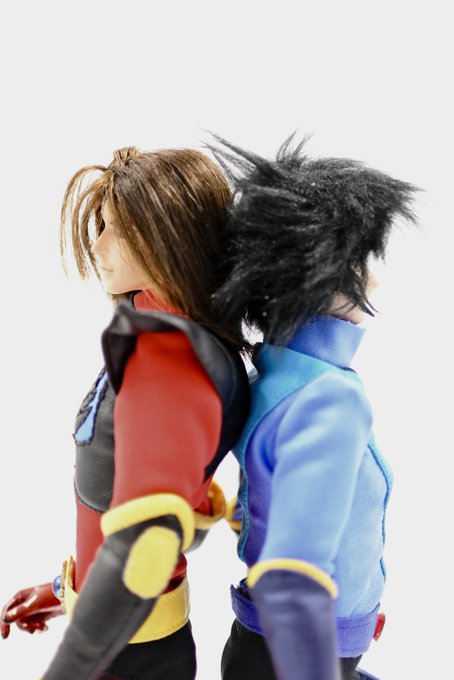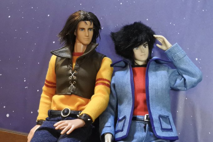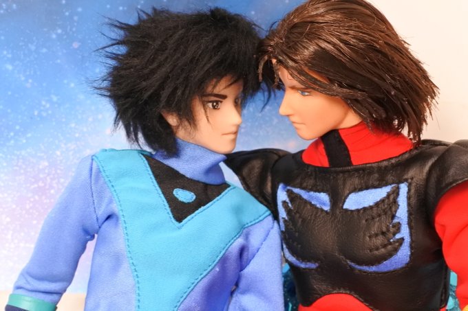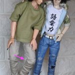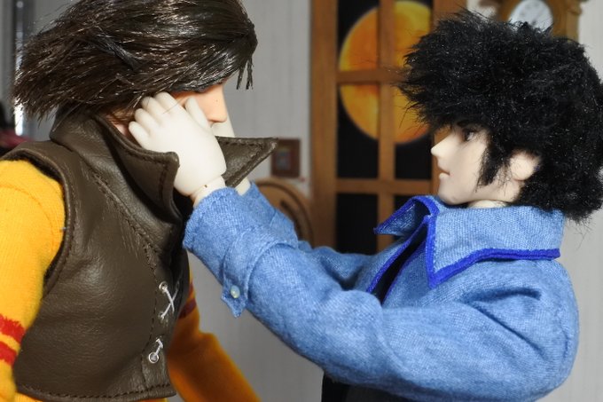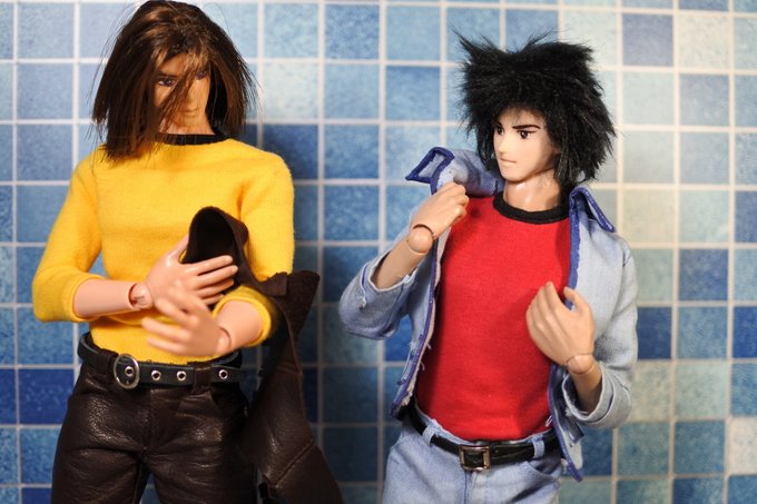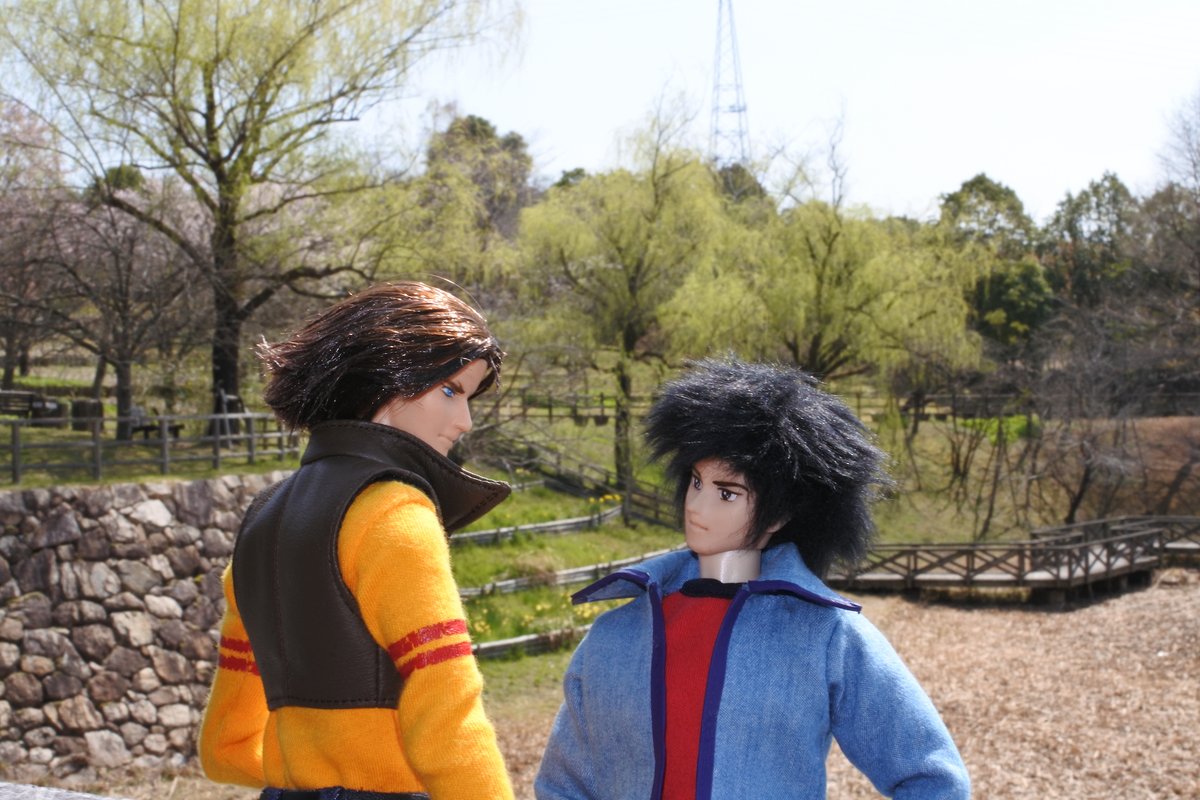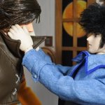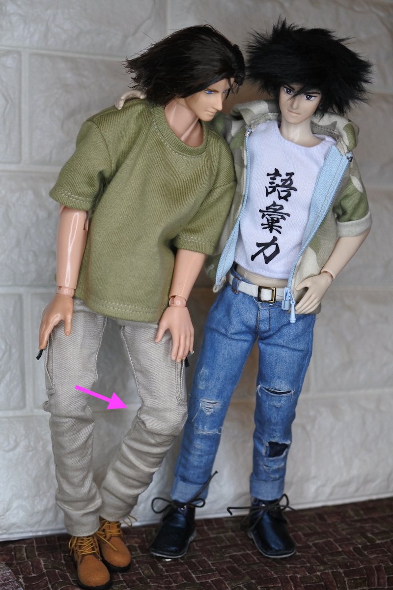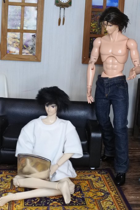 #今夜のドール撮影120分一本勝負 今夜のお題は【ひざをつく】※2枚め 「ねえ、甲児くん、僕のTシャツを知らないかい?」 「さあ」 「さあ、じゃなくてそれ僕のだろう?」 「いいじゃねえか。これが近くにあったんだし。俺のを探してる間にアイデアが逃げちまうだろ」