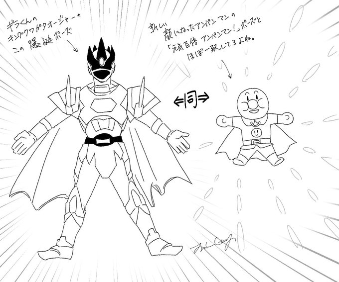 90 337 何度でも言いたいんですけど、ギラくんのキンクワオージャーとアンパンマンの元気百倍ポーズ概ね一致してると思うんですよ。 図にしてみたらますます確信に近づいた気がするんですよ。 23/07/14 22:55
