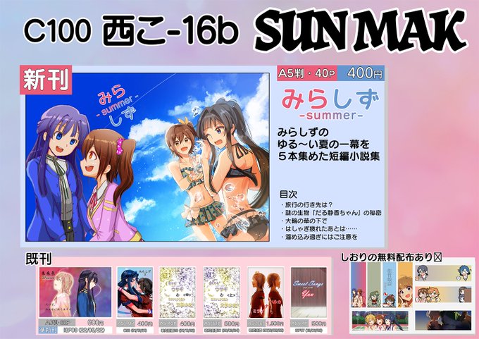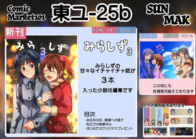 12/31(土) #C101 2日目東ユ-25b「SUN MAK」のお品書きです。 新刊は「みらしず 3」 みらしずの甘々な話を3本詰めた短編集です。 A5サイズの44P、頒布価格は400円になります。 その他既刊、無料配布のしおり等あります 本文のサンプルはリプにて #C101お品書き
