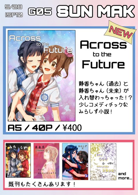 28 29 12/31(土) #C101 2日目東ユ-25b「SUN MAK」のお品書きです。 新刊は「みらしず 3」 みらしずの甘々な話を3本詰めた短編集です。 A5サイズの44P、頒布価格は400円になります。 その他既刊、無料配布のしおり等あります 本文のサンプルはリプにて #C101お品書き 22/12/26 19:50