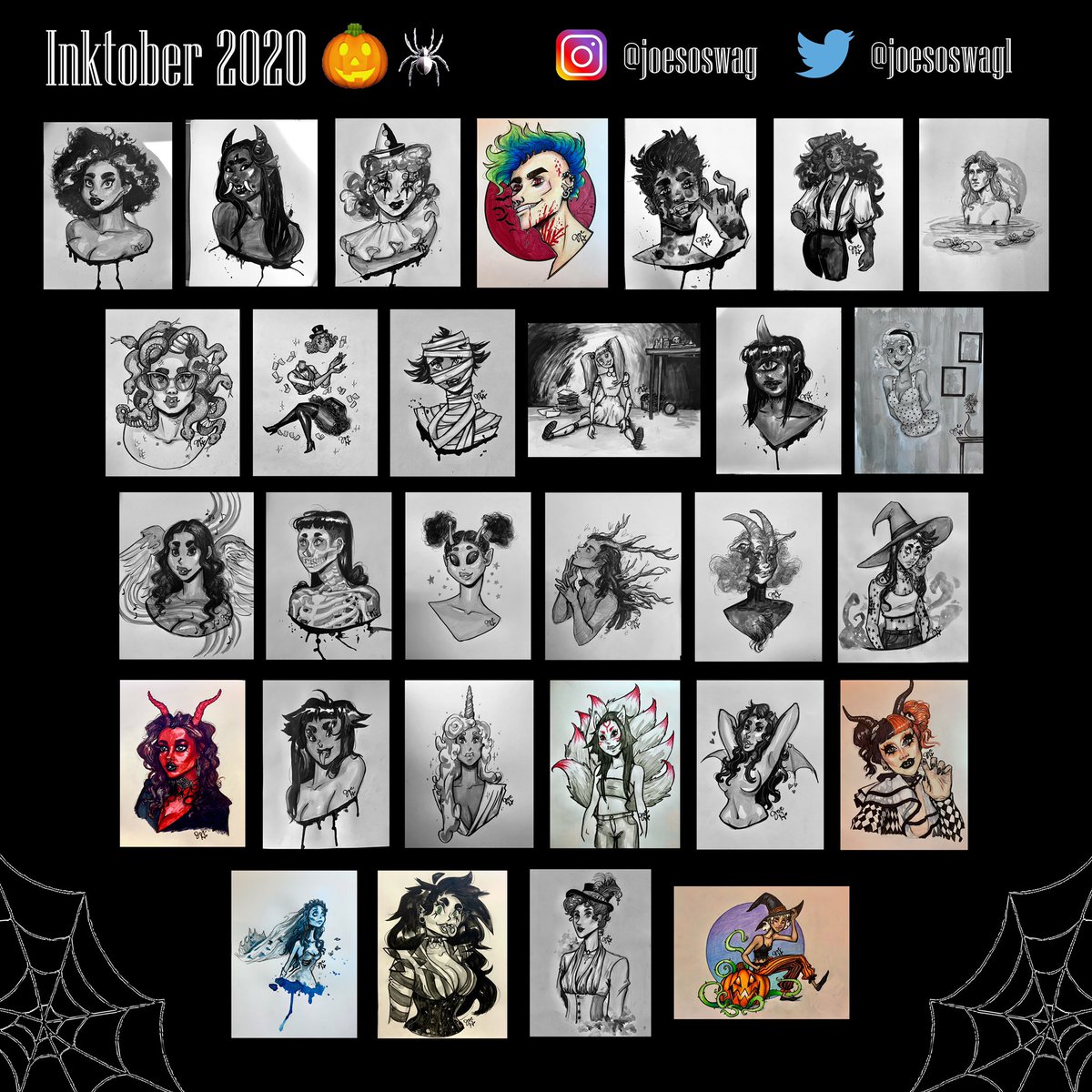 My full Inktober 2020 line-up 🎃🕸 Thank you to all the artists that made these awesome prompts ✨ #inktober #inktober2020 #witchtober #witchtober2020 #monstermania #monstermania2020 #neimytober2020 #itslopezwitchtober2020 #isabellesbabetober2020 #babetober2020