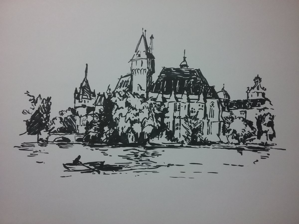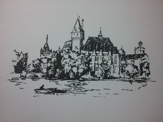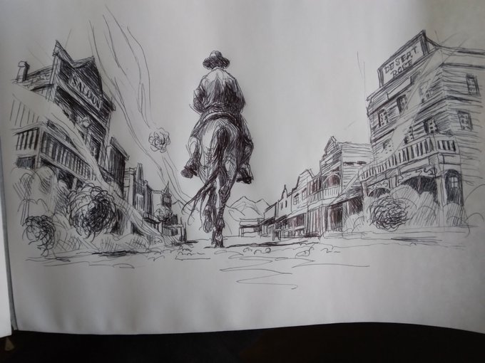Inktober day 18. Quaint Tyrolean Village Probably the most I'll get done with this one. Pen ran out. Went with a ballpoint, which I hadn't planned on. Intended to be a quicker marker sketch. Nobody on the street. #inktober #inktoberday18 #inktober22 #art #artwork #western #cowboy