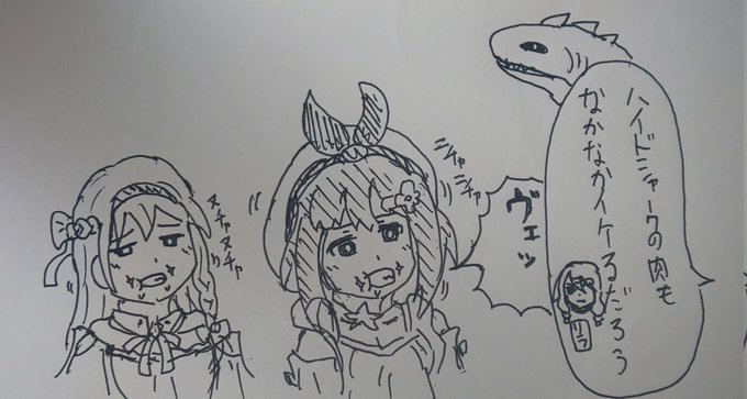0 2 ハイドシャークの肉を食べるライザとクラウディアを描きました #アトリ絵 22/12/15 21:43