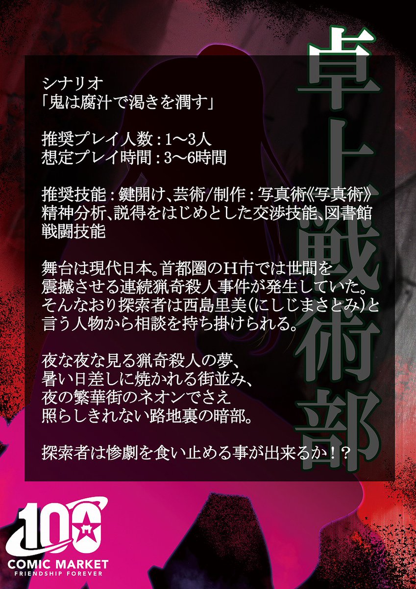 と、言う事でスペース頂けました!原稿とカレンダーと睨めっこする日々が始まります!!! あなたのサークル「卓上戦術部」は、コミックマーケット101で「金曜日東地区 "T " 21b」に配置されました!コミケWebカタログにてスペース配置場所公開中です! webcatalog.circle.ms/Circle/Map/168… #C101WebCatalog