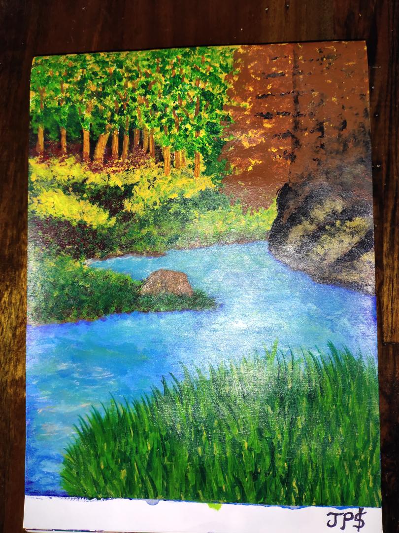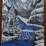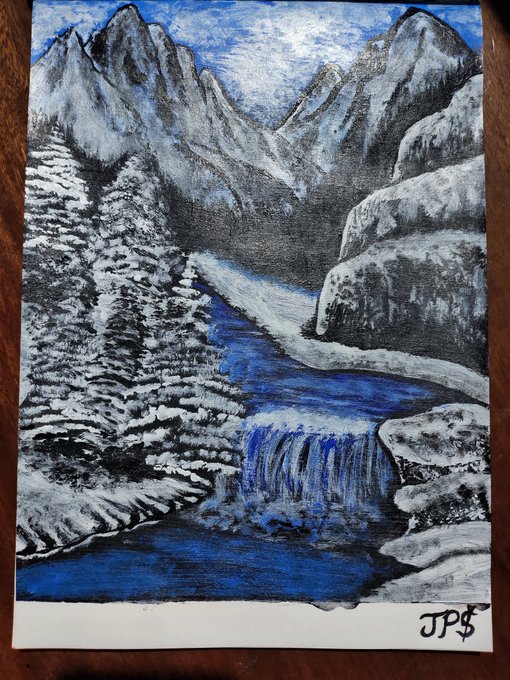 It's winter so I thought why not paint a cold place. #painting #cold #paintingoftheday #snowfall #WinterVibes #pine #ice #waterfall #artistontwitter #mountain