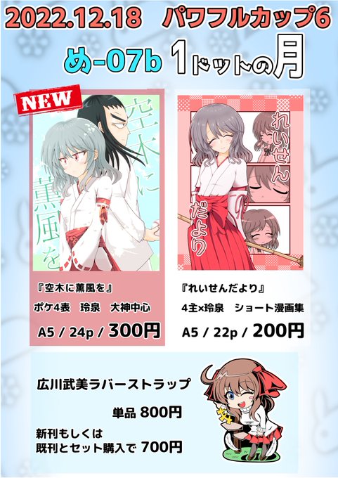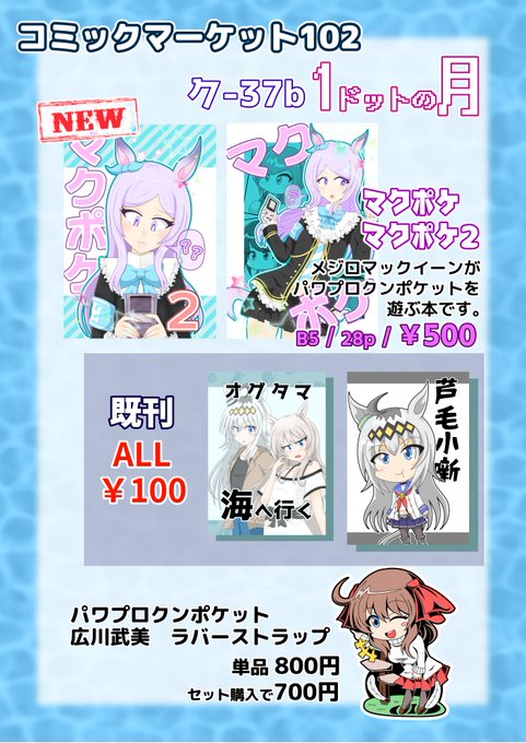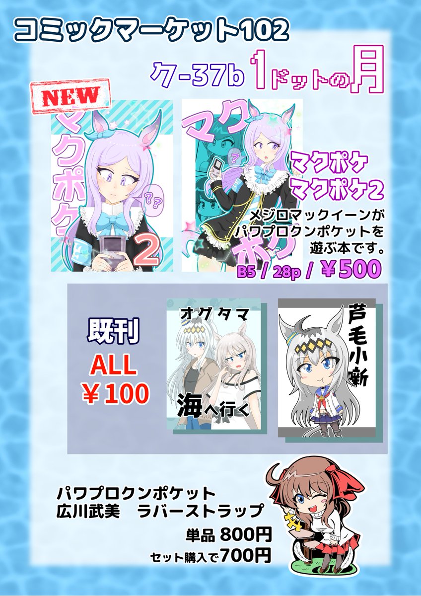 8 14 【宣伝】冬コミのお品書きです。武美ラバーストラップと今年出した既刊も持っていきます! 本文サンプルはツリーに載せておきます!! 金曜日 西ほ-42a「1ドットの月」よろしくお願いします✨ #C101 #ウマ娘 #パワポケ 22/12/22 22:45