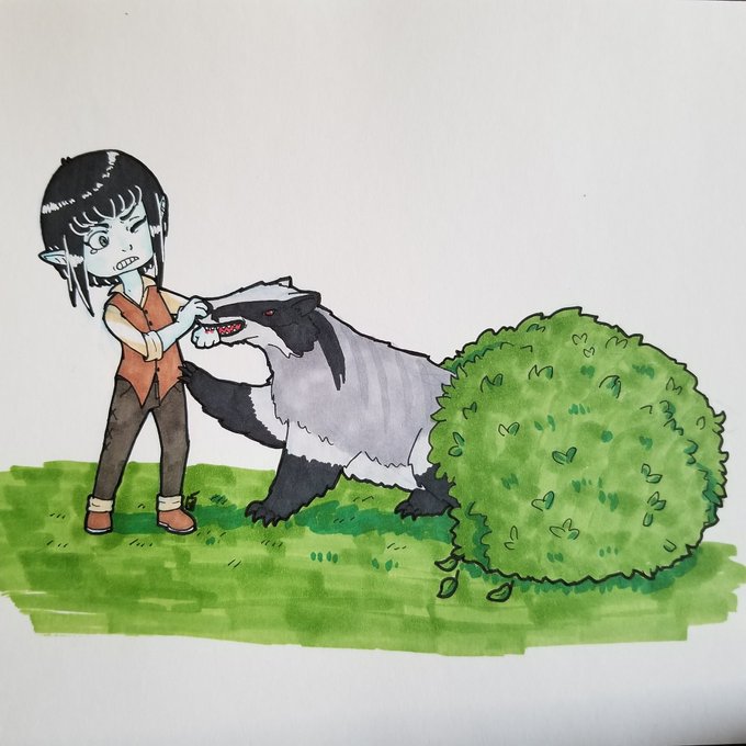 Inktober 2019, day 9. Surprise attack! It's a giant badger! Fight back, Caelynn! #Inktober2019 #inktober #dnd #dnd5e #dungeonsanddragons #giantbadger #badger #elf #warlock #traditional