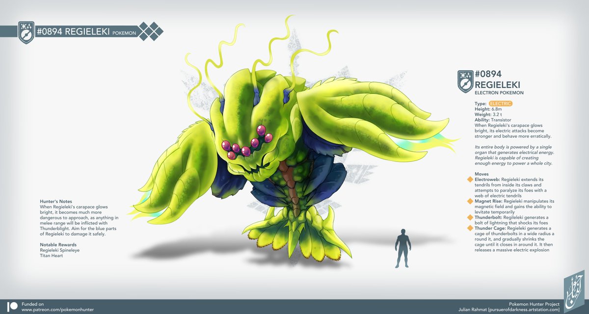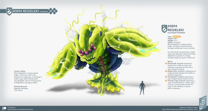 Drew up some concepts for the first three Titans! They are similar to the carapaceons of Monster Hunter. Regieleki and Regidrago concept art will be exclusive on my patreon: bit.ly/3NI8rw4