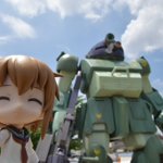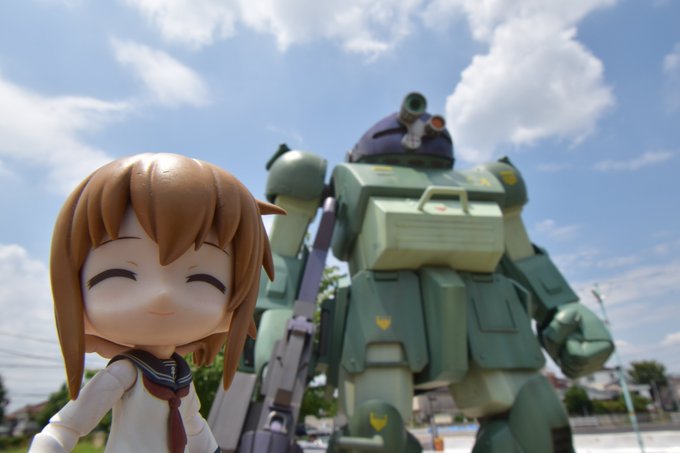 1 1 久々のお外撮り! 稲城長沼駅前の1/1スコープドッグを背景に電ちゃんとパシャリ!! むせる(*´▽`*) #キューポッシュ 23/06/25 15:45