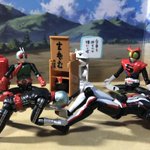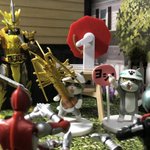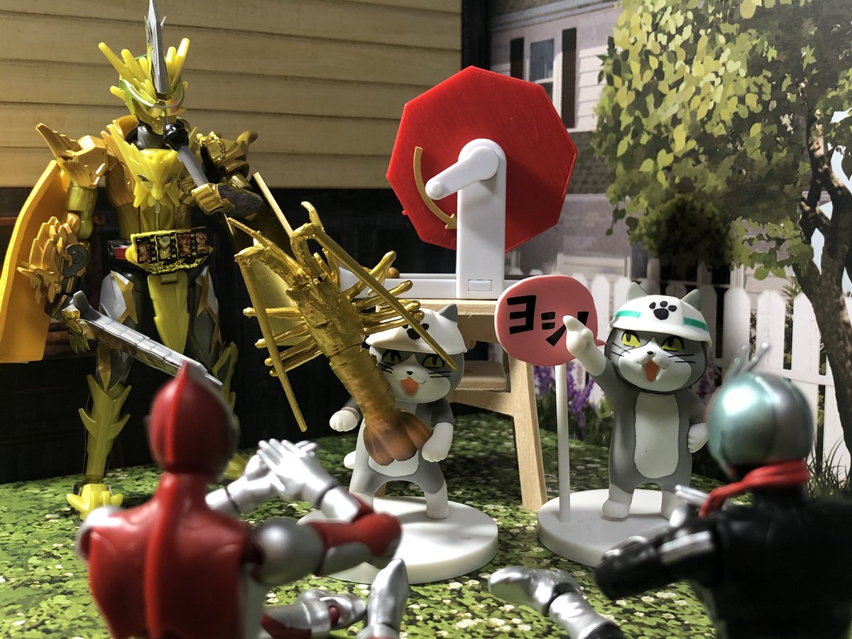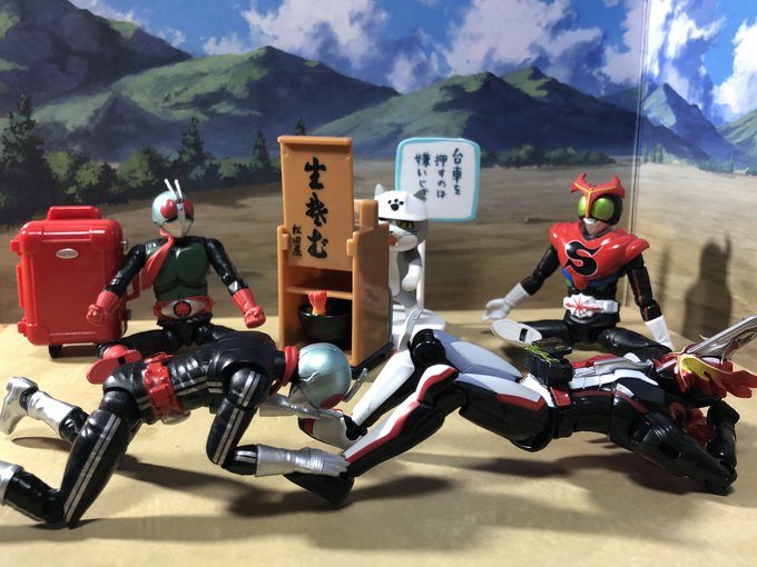先輩ライダー「セイバー頑張れ」 セイバー「かなりしんどいです…」 1号ライダー「仕事猫さんが出前天ぷら蕎麦を持ってきてくれたよ!終わったら食べれるから頑張れ!」 セイバー「匂いたまらないですね🤤頑張ります💪🏻」 #黒猫キャンペーン3 #仮面ライダーセイバー #オモ写