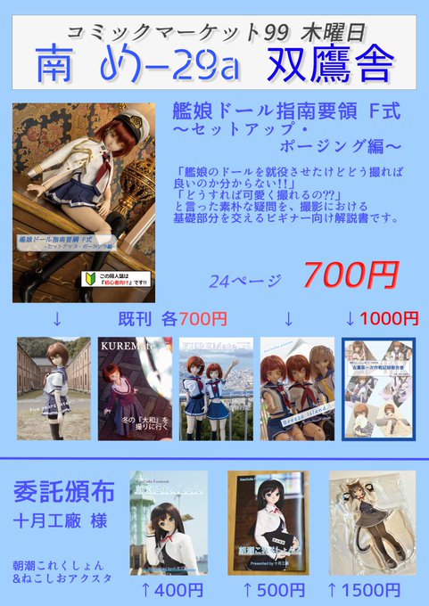 お品書きの方ですが、盛大にミスっていたので修正して再掲します C99 木曜 南め-29a『双鷹舎』 当日は十月工廠さん(@chihaken96)の委託品もございますので、宜しくお願いします #C99A #艦これ #艦これドール webカタログ:webcatalog.circle.ms/Circle/15703712 書店委託:melonbooks.co.jp/detail/detail.…