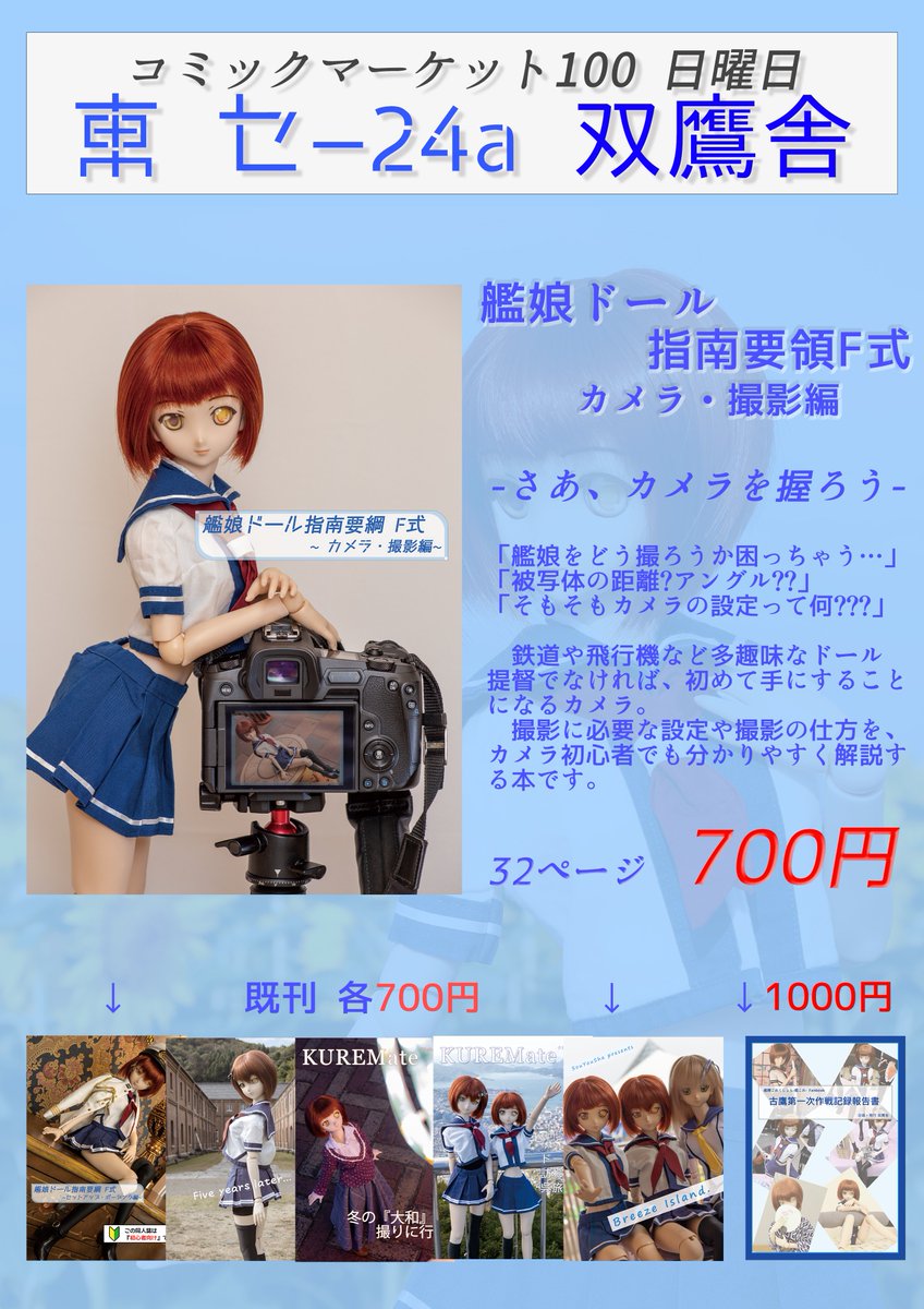 あなたのサークル「双鷹舎」は、コミックマーケット100で「日曜日東地区 "セ "24a」に配置されました! というわけでC100は、予告通り冬に出した艦これドール撮影指南の後編、撮影にかかわるアレコレの予定です(˘ω˘) webcatalog.circle.ms/Circle/Map/162… #C100WebCatalog #コミケ100 #C100 #艦これドール