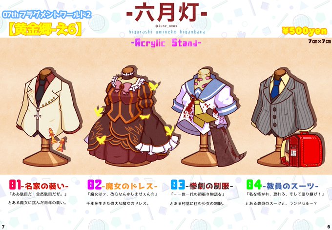 2月12日の07th フラグメントワールド2で頒布するアクリルスタンド全4種です🌟 サイズは7㎝×7㎝となっています😌 台座は各作品それぞれ 蝶【うみねこ】菱形【ひぐらし】桜【彼岸花】 となっています🎃 是非お手に取ってみてください😇 #07thフラグメントワールド2 #うみねこのなく頃に