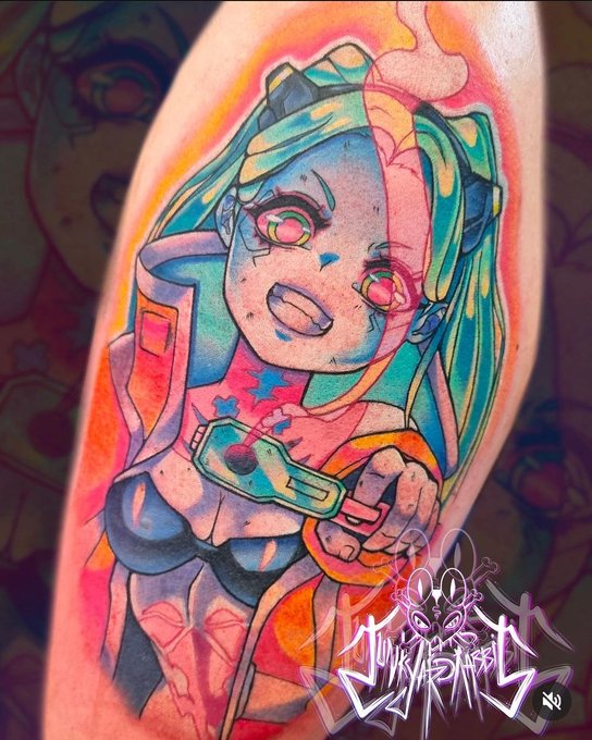 Rebecca Tattoo I did as one of my last ones for the year! It's been an amazing and crazy year for me Tattooing, but next year I'll be taking more time for myself to draw digital again and make art as well as Tattoos! #CyberpunkEdgerunners #Cyberpunk2077 #anime #animetattoo