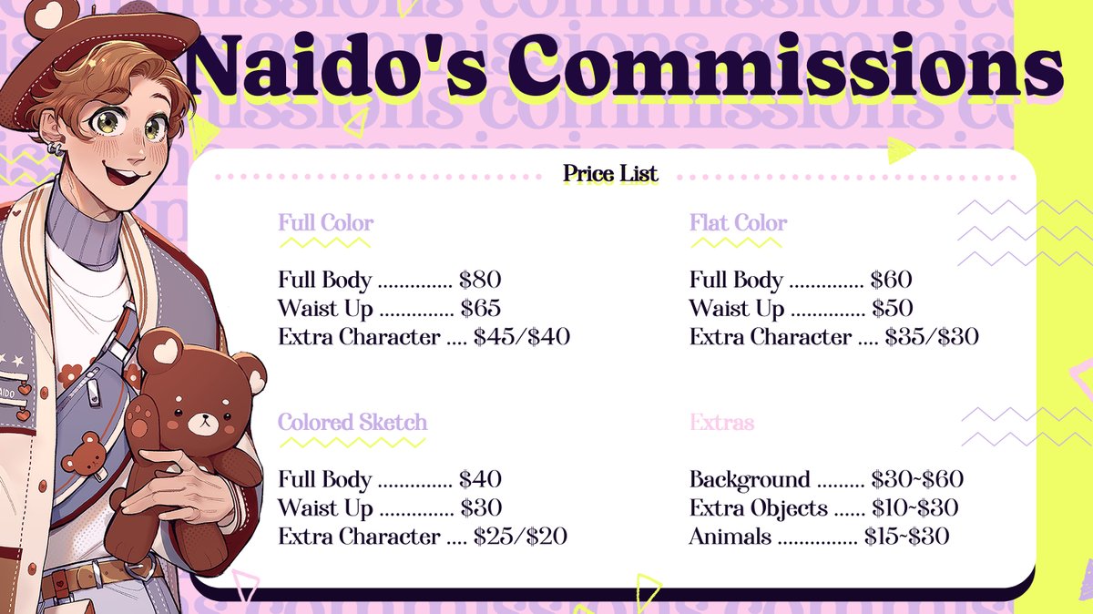 [๐RTs are appreciated๐] I'm opening commis again ! โฐ(*ยด๏ธถ`*)โฏโจThere are 5 slots and 3 wait list spots availableโ๏ธ For samples, terms of service and fees please refer to my carrd ! justnaido.carrd.co ห เผ โก โ๏ฝกห ๐บ