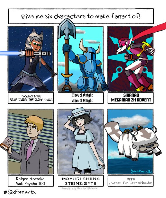 My first #SixFanartsChallenge attempt! Thanks to Instagram users for Ahsoka and Appa requests, @RustyTermina for Shovel Knight request, @Dusky67286472 for Siarnaq request, and @Miss_Marimuuzle for Reigen and Mayuri requests. #SixFanarts #art #drawing #digitalart #FanArtFriday