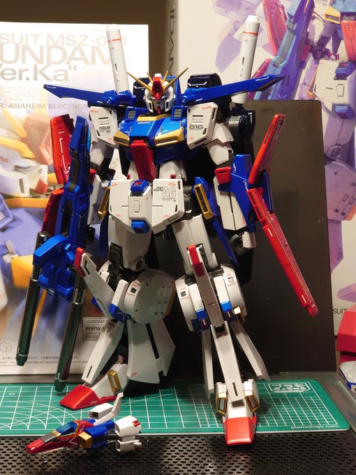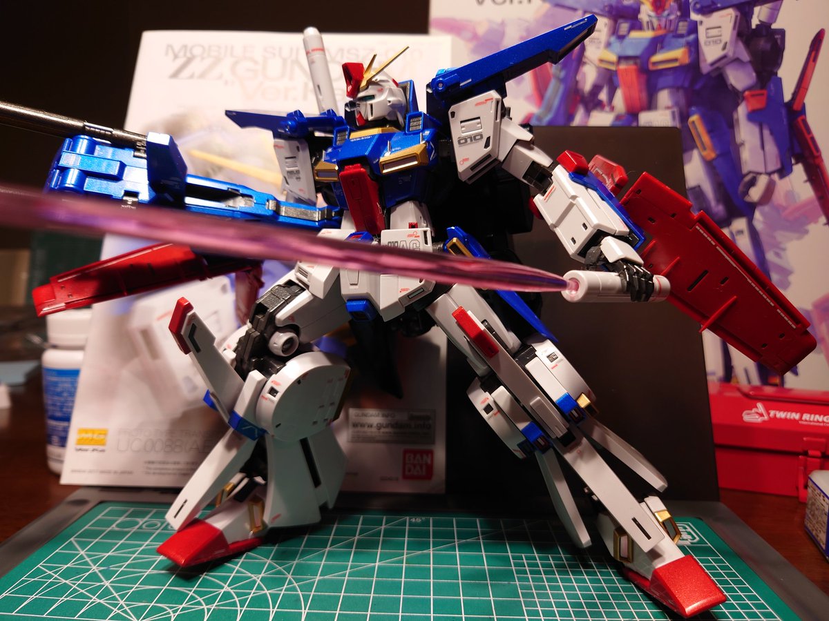 MG ZZ Ver.Ka 制作4日目。花粉症と疲れ目からしっかり休み、この日は朝5時から始めて塗装と組上げおわりました。後はデカール貼り。貼った後はやっぱクリアー吹いた方がいいのかなぁ… #ガンプラの画像を貼るとRTされると聞いて