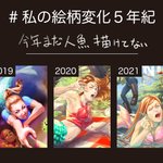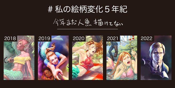テンプレートの作成は@NONNKI_irさん。お借りします! #私の絵柄変化5年紀 2018→クロッキーばっかやってた。まともに描いた絵はこれだけだった 2019→その結果、表情やポーズが動的になった 2020→もっと激しい表情を描きたくなった 2021→変顔が楽しくなってきた 2022→突然光の当たり方に興味が出た