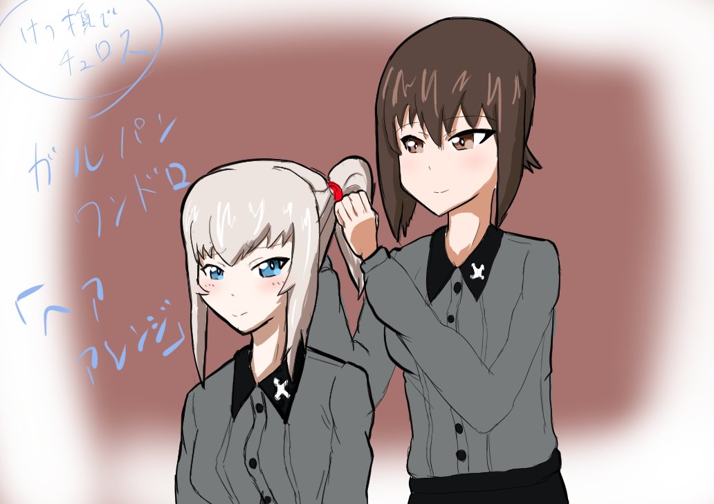 #ガルパン版深夜のお絵描き60分一本勝負 #ガルパン版深夜のお絵描き60分一本勝負_20200308 お題テーマ「ヘアアレンジ」 まほネキに結ってもらうポニテ逸見です。 初ワンドロです!