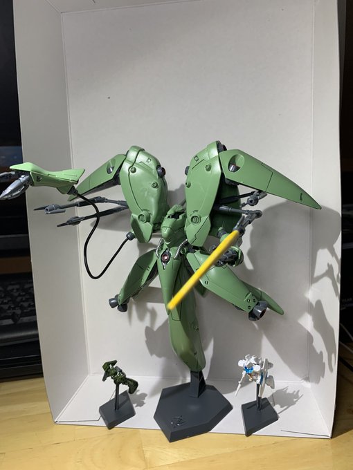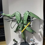 ノイエ・ジール完成。下にある小さいのが接着剤使用で、塗装に時間がかかった。ステイメンの方は小さすぎて私には無理。プラモコーナー閉じるので半額になってるヤマダ電機でプラモ系ツール買いまくってしまい、もう後に引けなくなっている。 #ガンプラの画像貼るとRTされると聞いて #ガンプラ