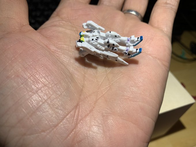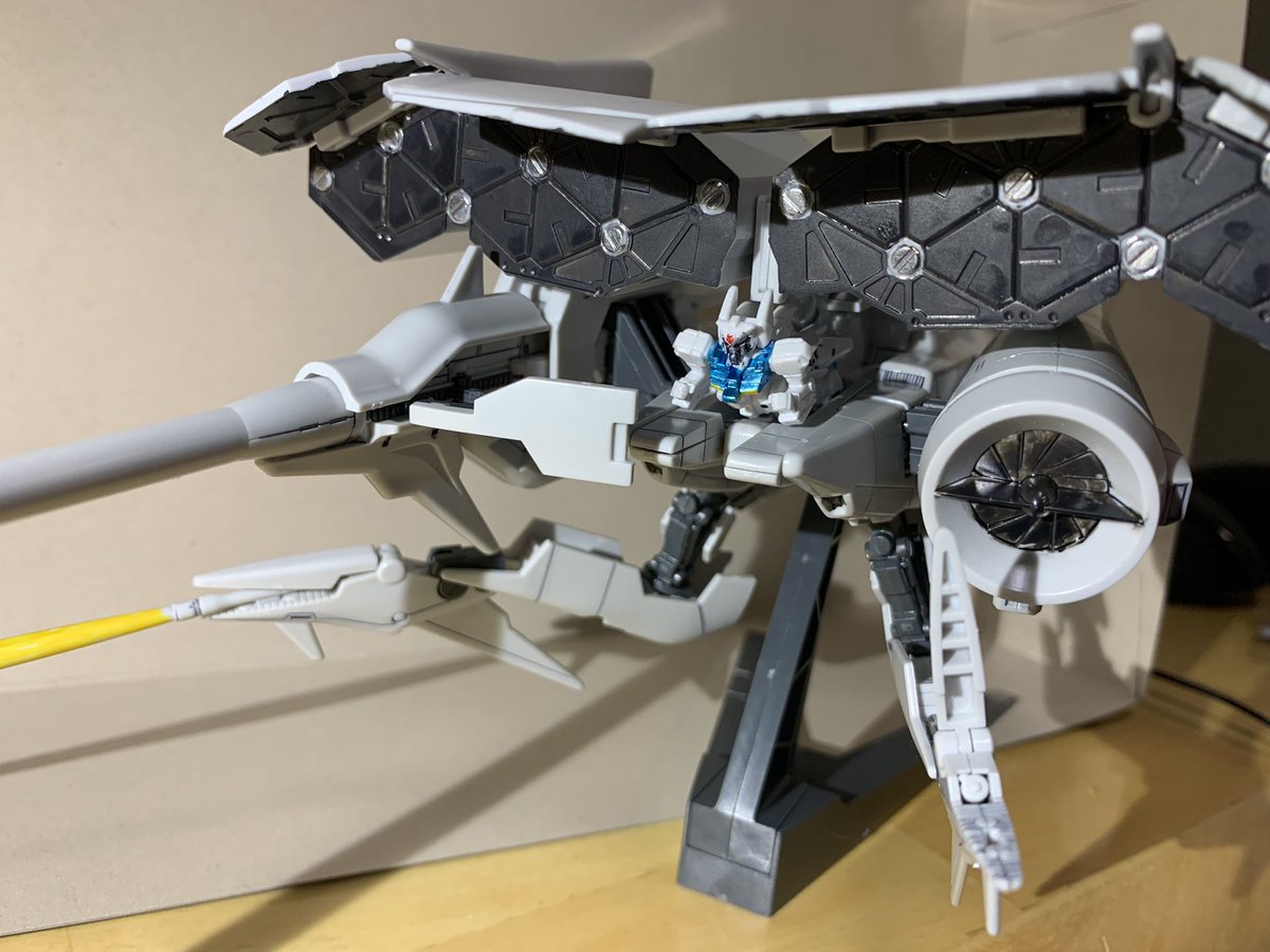 さて、お次はコレ。無論、あの1m超えのヤバい奴ではなく、1/550。コンテナの中のグレーとシルバーは頑張って塗った。ステイメンやクローがまだなので完成してませんが、一応ここまでやりました。 #ガンプラの画像を貼るとRTされると聞いて #ガンプラ