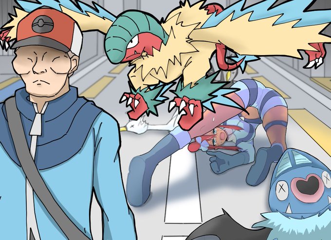 2日前のポケセン封鎖7日目(03:43:10〜)で鬼門と言われていたフウロ戦を苦もなく3タテで圧勝するうんこちゃんとジェットをイラストで描き起こしてみました #加藤純一 #ポケモンBW