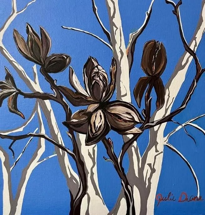 Explore our online art exhibition, “Paint Your Heart Out.” kbmartgallery.com “Winter Branches and Shells” Julie Drane Acrylic 10” x 10” 2022 $175
