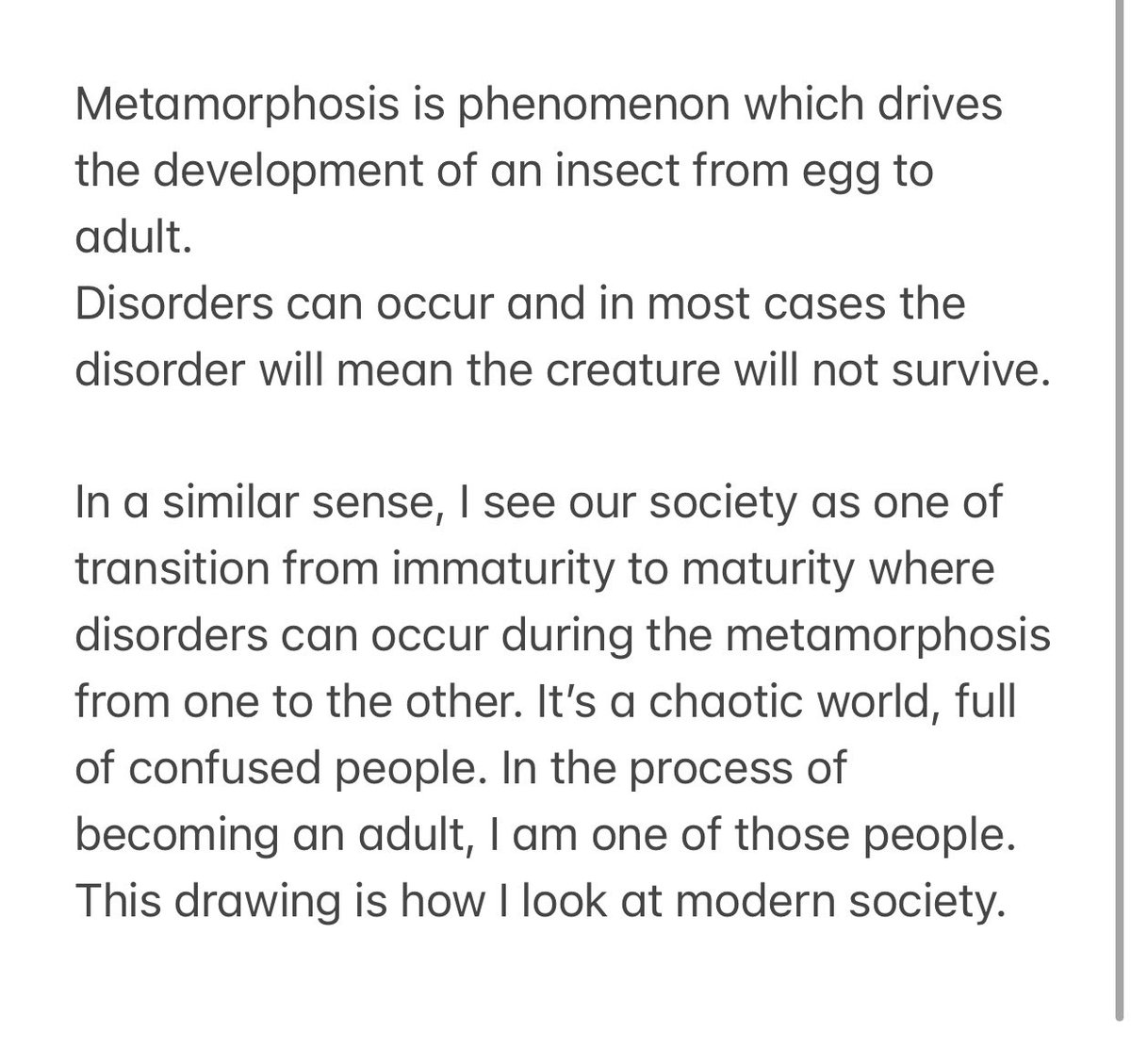 「羽化不全」 昆虫が幼虫またはさなぎから成虫に脱皮変態する際に羽化できず死亡、奇形で羽化すること 成熟と未成熟、適合と不適合が混在する、そんな私のような羽化不全な人々が潜む混沌とした現代社会を描きました