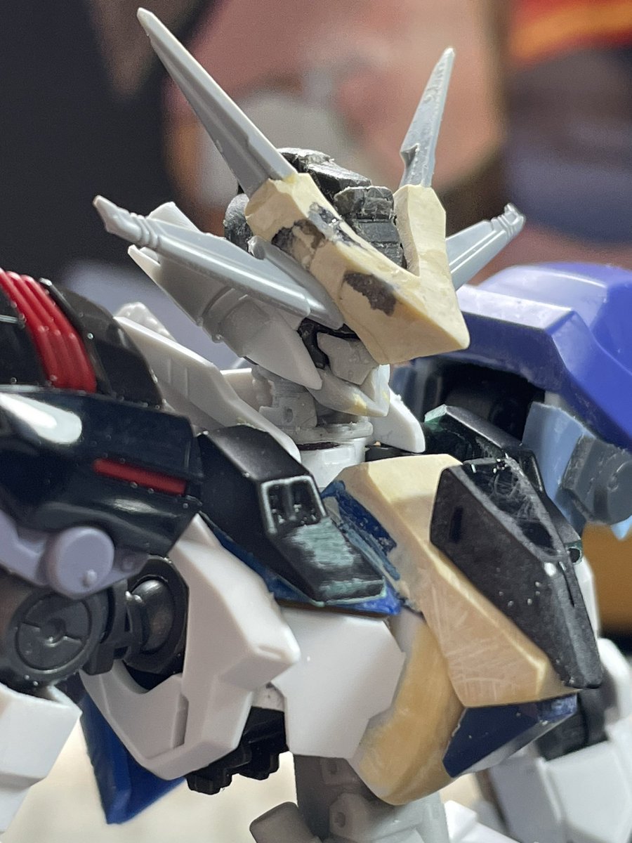 #ガンプラの画像を貼るとRTされると聞いて #ガンプラ好きな人と繋がりたい アガレス進捗、肩の形状変更とサイドを可動式に、膝ガードとスカートの形状変更、フェイスはトサカガードを新造しました、段々とパテで作りたい形を作れるようになって来た気がする🤔