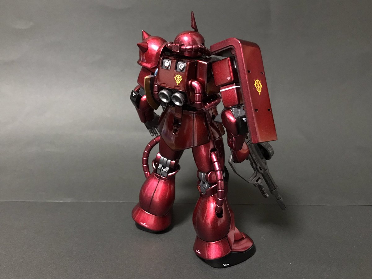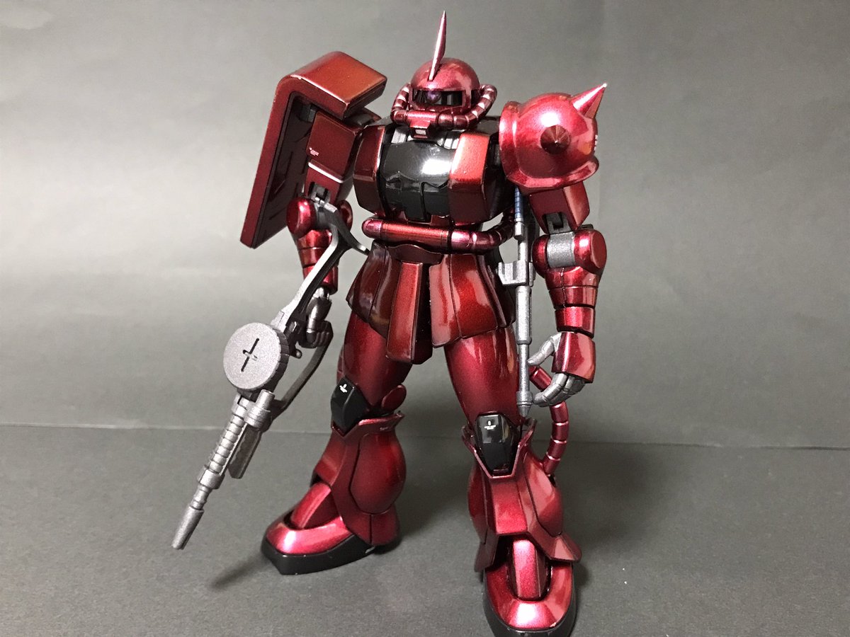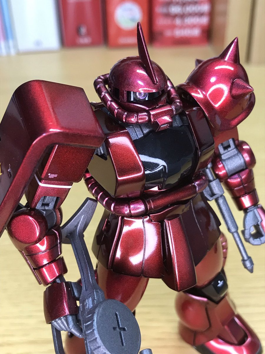 HG シャアザク完成! 全体をキャンディ塗装で仕上げ、コンパウンドで磨きました。 写真撮るの下手くそすぎて伝わりにくいですが、想像以上に綺麗な光沢を得ることができました! #ガンプラ #ガンプラ好きと繋がりたい #ガンプラの画像貼るとRTされると聞いて